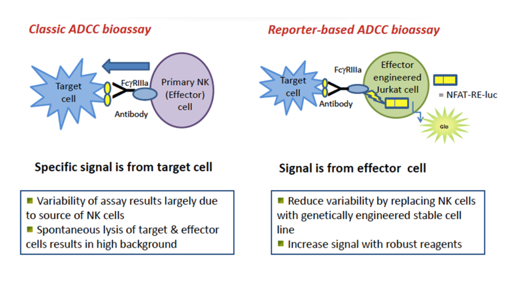 安泰吉公司与合作伙伴联合开发的Reporter-based ADCC bioassay,显著优于Classic ADCC bioassay,原理如下: