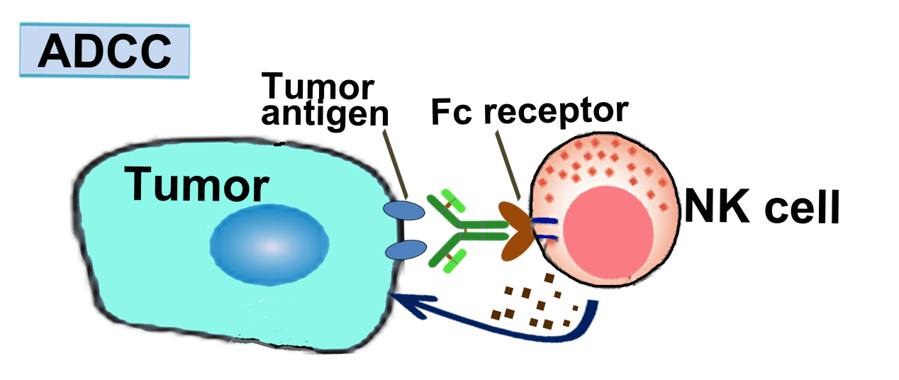 ADCC效应,为“抗体依赖的细胞介导的细胞毒作用”(antibody-dependent cell-mediated cytotoxicity),是机体抗感染、抗肿瘤的重要免疫机制。当IgG抗体通过Fab段与靶细胞(病毒感染的细胞及肿瘤细胞)表面抗原决定簇特异性结合后,其Fc段可与有FcγR的杀伤细胞(NK细胞、单核-巨噬细胞、中性粒细胞)等效应细胞结合,触发效应细胞的杀伤活性,直接杀伤靶细胞(病毒感染的细胞及肿瘤细胞)。
